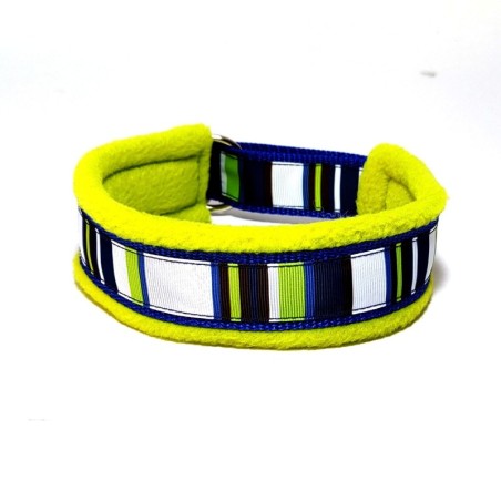 Halvkvæler halsbånd: 30mm blå webbing - lime fleece - Blue & Green Stripes pyntebånd - sølv D-ringe - str 43/50cm