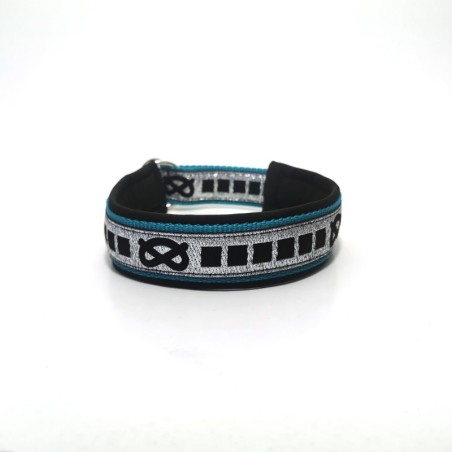 Halvkvæler halsbånd: 30mm petroleum webbing - sort softshell - sølv SBT pyntebånd med sort knob - sølvfarvet D-ringe - str 38/46cm