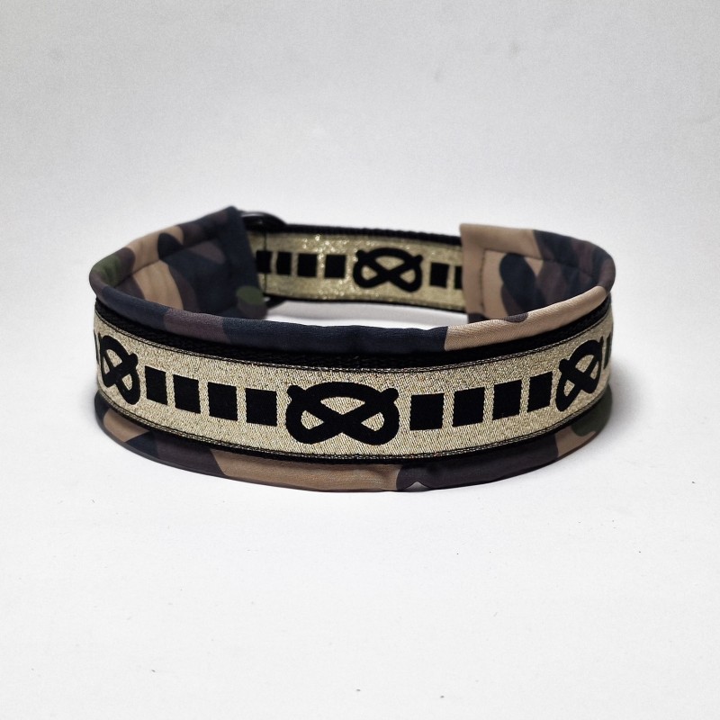 Halvkvæler halsbånd: 30mm sort webbing - camo softshell - guld SBT pyntebånd med sort knob - sort D-ringe - str 43/50cm